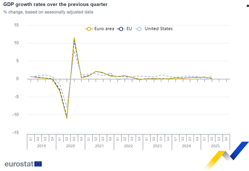 עלה ב0.1% ברבעון השני של 2025 בהשוואה לרבעון הקודם. בהשוואה לרבעון השני בשנה שעברה קצב הצמיחה באירופה (GDP) עלה ב1.6% ובאיחוד האירופי ב1.6%.