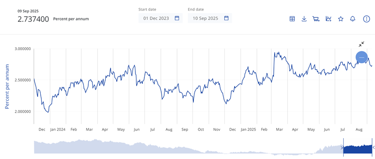 2.15% מתאריך 11/07/25. הבנק המרכזי באירופה מוריד באופן תכוף את הריבית כבר מעל לשנה, לדברי מועצת הנגידים האירופית החלטת הריבית תלויה בעמידה בשיעור אינפלציה של כ2% שנתי.
