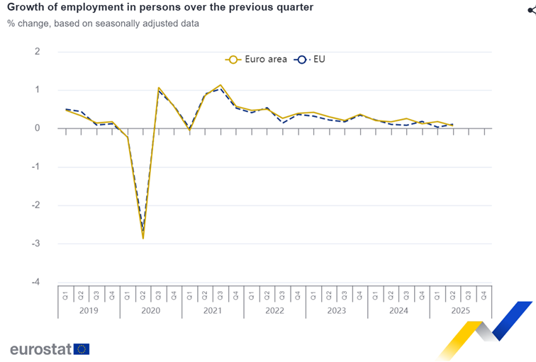 שיעור התעסוקה באירופה עלה ב0.1% ברבעון השני לשנת 2025. ברבעון הראשון היתה עליה של 0.2%.