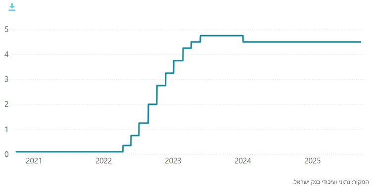 4.5% מתאריך 6/1/24. החלטת הריבית הקרובה: 29/9/25. בהחלטת הריבית האחרונה שהיתה ב20/08 החליטה ועדת הריבית להשאיר את הריבית כמו שהיא, הועדה הסבירה שההחלטה נתמכת בפיחות (זמני) שהיה בחודש שלפני אותה החלטה, במצב הבטחוני הלא יציב, והאינפלציה שאינה ביעד אך קרובה.