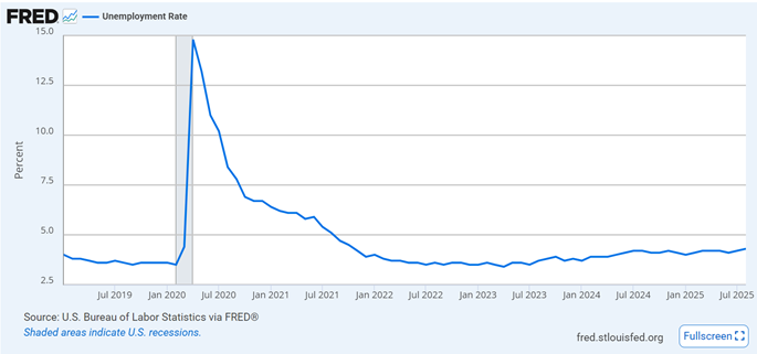 4.3% מתאריך 05/09/2025. שיעור האבטלה עלה ב0.1% משנה שעברה. זה לא שינוי משמעותי. שיעור האבטלה גבוה ביחס למה שהיה לפני הקורונה (3.6% בינואר 2020).