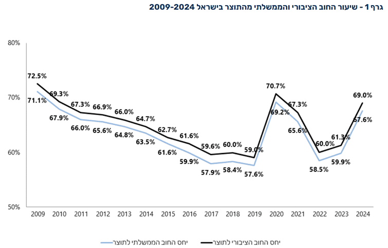 יחס החוב לתוצר הלאומי הוא 69% בשנת 2024 לעומת 61.3% בשנת 2023.