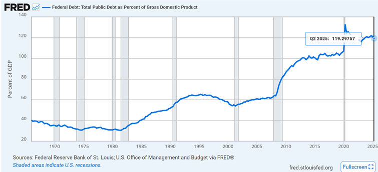 יחס החוב הממשלתי האמריקאי לתוצר הגולמי הוא 119%. עדיין מאוד מאוד גבוה, אך במגמת ירידה מ2020.
